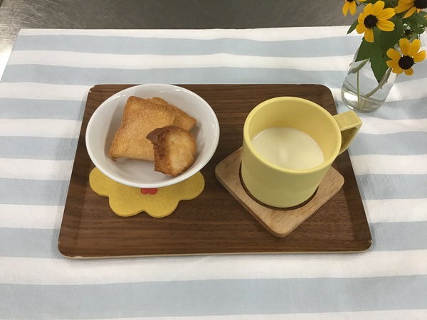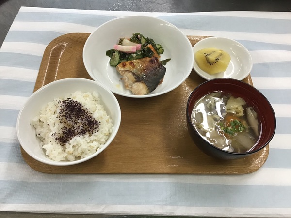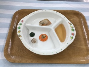 <離乳食>(1歳2ヶ月頃)・玄米ゆかりご飯・サバの塩こうじ焼き・かつお出汁の人参スティック・きゅうりとツナの和え物・かきたま汁・バナナ<幼児食>・玄米ゆかりご飯・サバの塩こうじ焼き・きゅうりとかまぼこのごま和え・かきたま汁・キウイフルーツ<おやつ>・ラスク・牛乳<ベジブロス>