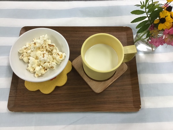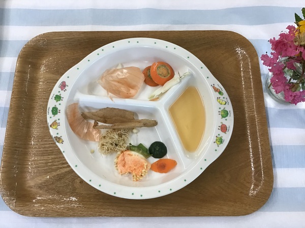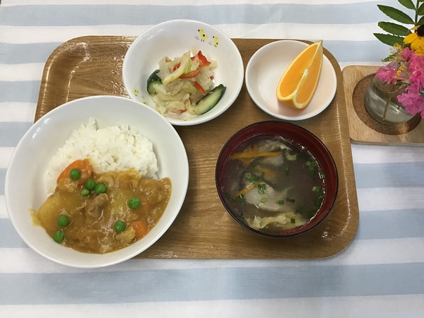<離乳食>(1歳1ヶ月頃)・軟飯・肉じゃが・きゅうりスティックのだし煮・みじんサラダ・卵スープ・オレンジ<幼児食>・ポークカレー・キャベツのマリネ・卵スープ・オレンジ<おやつ>・ポップコーン・牛乳<ベジブロス>