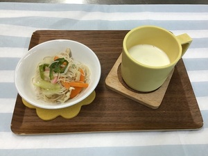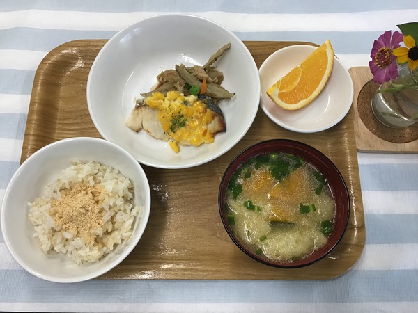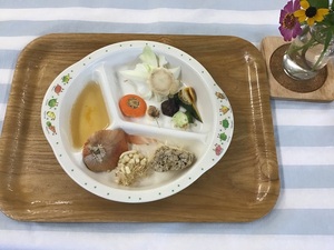<離乳食>(1歳頃)・玄米軟飯・魚のコーンマヨネーズ焼き・五目きんぴら・スティック人参とかぼちゃのだし煮・味噌汁・もも・きな粉<幼児食>・玄米ご飯・魚のコーンマヨネーズ焼き・五目きんぴら・かぼちゃの味噌汁・オレンジ・きな粉<おやつ>・焼きビーフン・牛乳<ベジブロス>