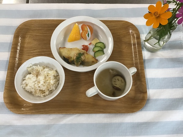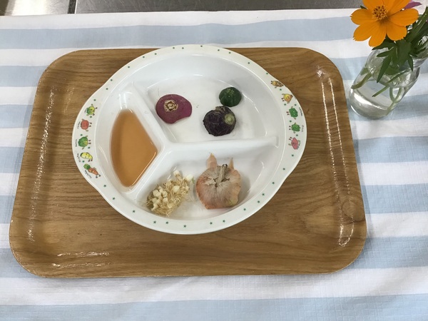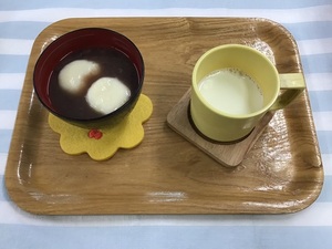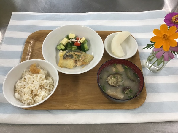 <離乳食>(1歳1ヶ月)・玄米ご飯・魚のカレームニエル・ささみとチーズの酢の物・茄子の味噌汁・オレンジ&ゼリー・きな粉<幼児食>・玄米ご飯・魚のカレームニエル・ささみとチーズの酢の物・茄子の味噌汁・梨・手作りニンニク味噌<おやつ>・冷やし白玉ぜんざい・牛乳<ベジブロス>