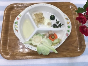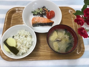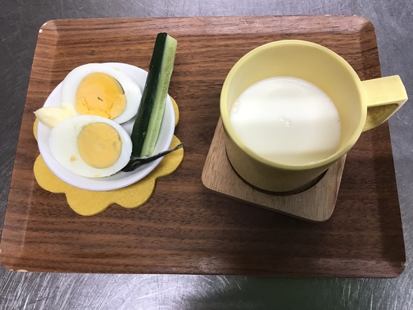 <給食>・わかめご飯・鮭の塩こうじ焼き・ひじきのマヨネーズ和え・ミニトマト・味噌汁・手作りたくあん<おやつ>・ゆで卵 スティックきゅうり・牛乳<ベジブロス>
