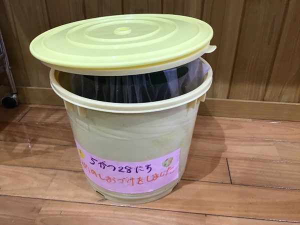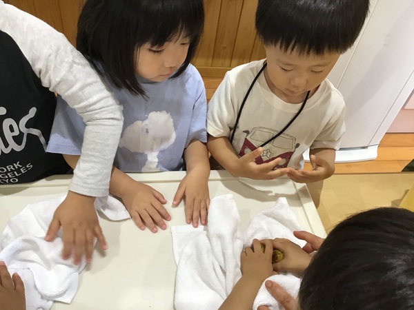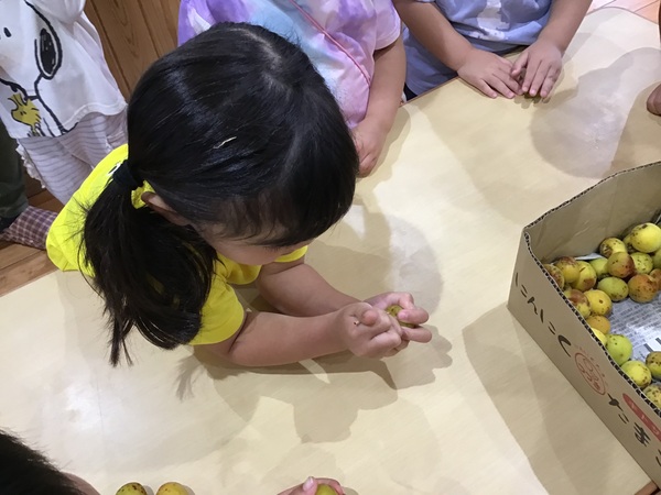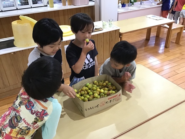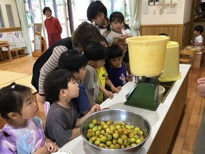 梅は、みなさんご存知かと思いますが、夏バテ予防にもってこいの食品ですね。子ども達は、梅に興味津々。