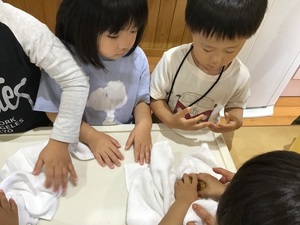 洗った梅はお布団に包んで、拭きましょう