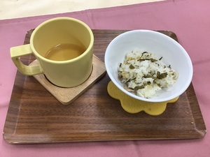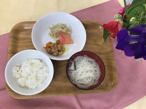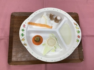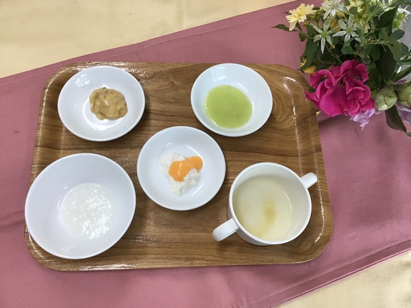 ≪離乳食≫5か月頃・おかゆペースト・豆腐ペースト・人参ペースト・キャベツペースト・ベジブロススープ・バナナペースト≪幼児食≫・ご飯・鶏の治部煮・もやしのソテー・トマト・そうめん汁≪おやつ≫・高菜チャーハン・麦茶≪ベジブロス≫